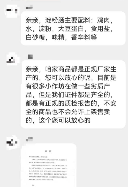 3月18日,記者聯(lián)系到電商平臺上淀粉腸銷量較高的商家,客服稱自家淀粉腸主要配料有雞肉,水,淀粉,大豆蛋白,食用鹽,白砂糖,味精,香辛料等,并承諾自家商品都是正規(guī)廠家生產(chǎn)。“您可以放心的呢,目前是有很多小作坊在做一些劣質(zhì)產(chǎn)品,但是我們證件都是齊全的,都有正規(guī)的質(zhì)檢報告,不安全的商品也不會允許上架售賣。”當(dāng)被問及是否受到骨泥事件影響,客服稱最近仍有大量買家,并將廠家近期發(fā)布的聲明再次發(fā)給消費(fèi)者,以確保自家淀粉腸的安全性。