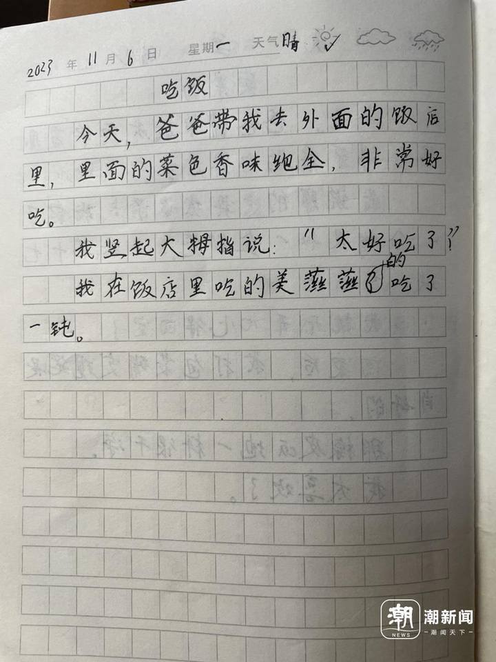 哥哥的日記本里有一篇《吃飯》,字跡很端正,他寫(xiě)道:“今天爸爸帶我去外面的飯店,里面的菜色香味俱全,非常好吃,我豎起大拇指說(shuō),太好吃了!我在飯店里美滋滋地吃了一頓。”