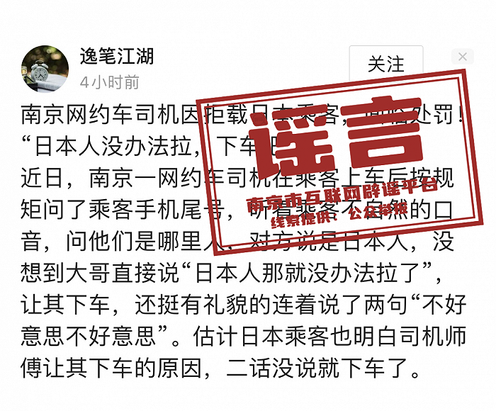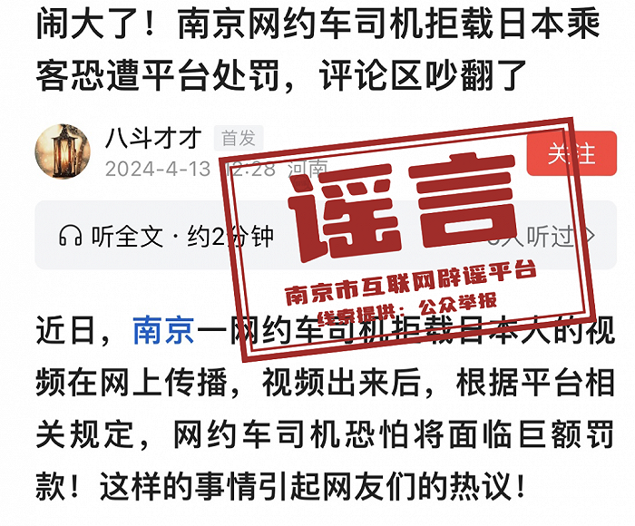 南京網(wǎng)絡(luò)辟謠官微消息,近日,網(wǎng)上流傳“一名日本游客在南京使用網(wǎng)約車服務(wù)時,遭遇司機(jī)拒載”的消息,并配有車內(nèi)監(jiān)控畫面。有自媒體捏造稱,南京市交通局發(fā)布了緊急通告,表示將對涉事網(wǎng)約車司機(jī)進(jìn)行嚴(yán)肅處理。一時之間,引發(fā)不少評論和爭議。