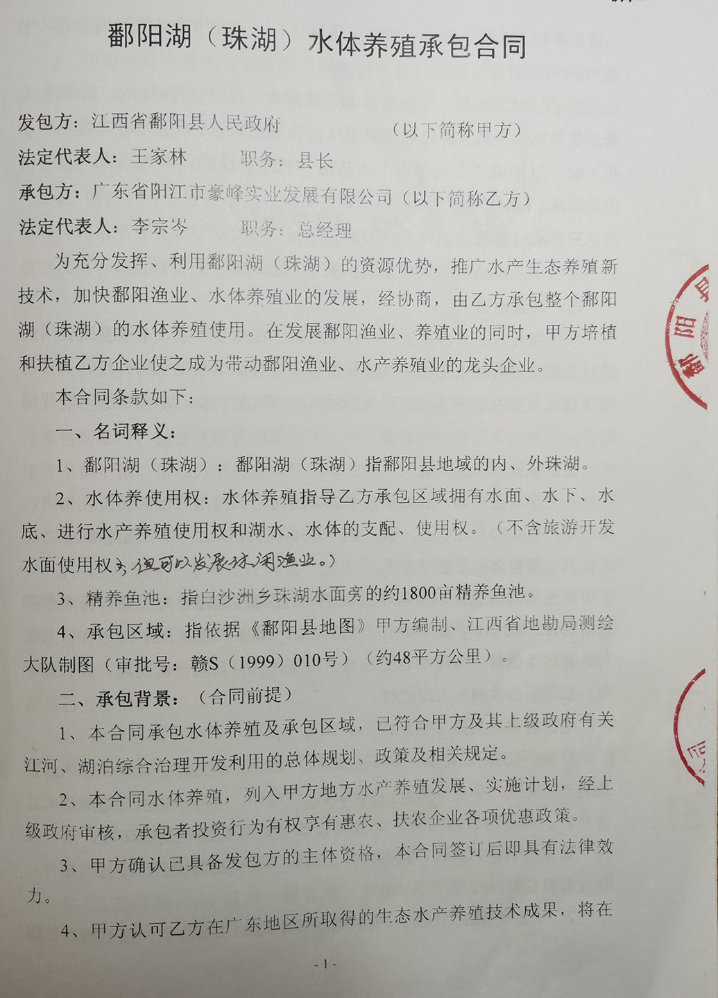 簽訂合同后,李宗岑成立江西省鄱陽(yáng)湖壹號(hào)水產(chǎn)發(fā)展有限公司(以下簡(jiǎn)稱“壹號(hào)水產(chǎn)公司”),挖土建設(shè)魚(yú)塘,并建廠房、辦公樓等設(shè)施。其承包的水域原屬國(guó)營(yíng)的珠湖水產(chǎn)養(yǎng)殖場(chǎng),具備較好養(yǎng)殖條件。據(jù)李宗岑稱,承包十多年來(lái),他每年向珠湖投放魚(yú)苗一千多萬(wàn)元。