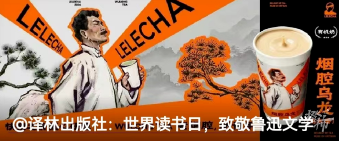 4月23日,樂樂茶與譯林出版社開啟聯(lián)名活動,網(wǎng)友發(fā)布的照片顯示,在部分樂樂茶門店,相關(guān)宣傳物料中包括魯迅先生的形象,并寫有“老煙腔 新青年”字樣。小程序點單時,頁面先跳出的是魯迅先生的頭像等。在產(chǎn)品方面,相關(guān)杯子的包裝也印有魯迅先生的形象。